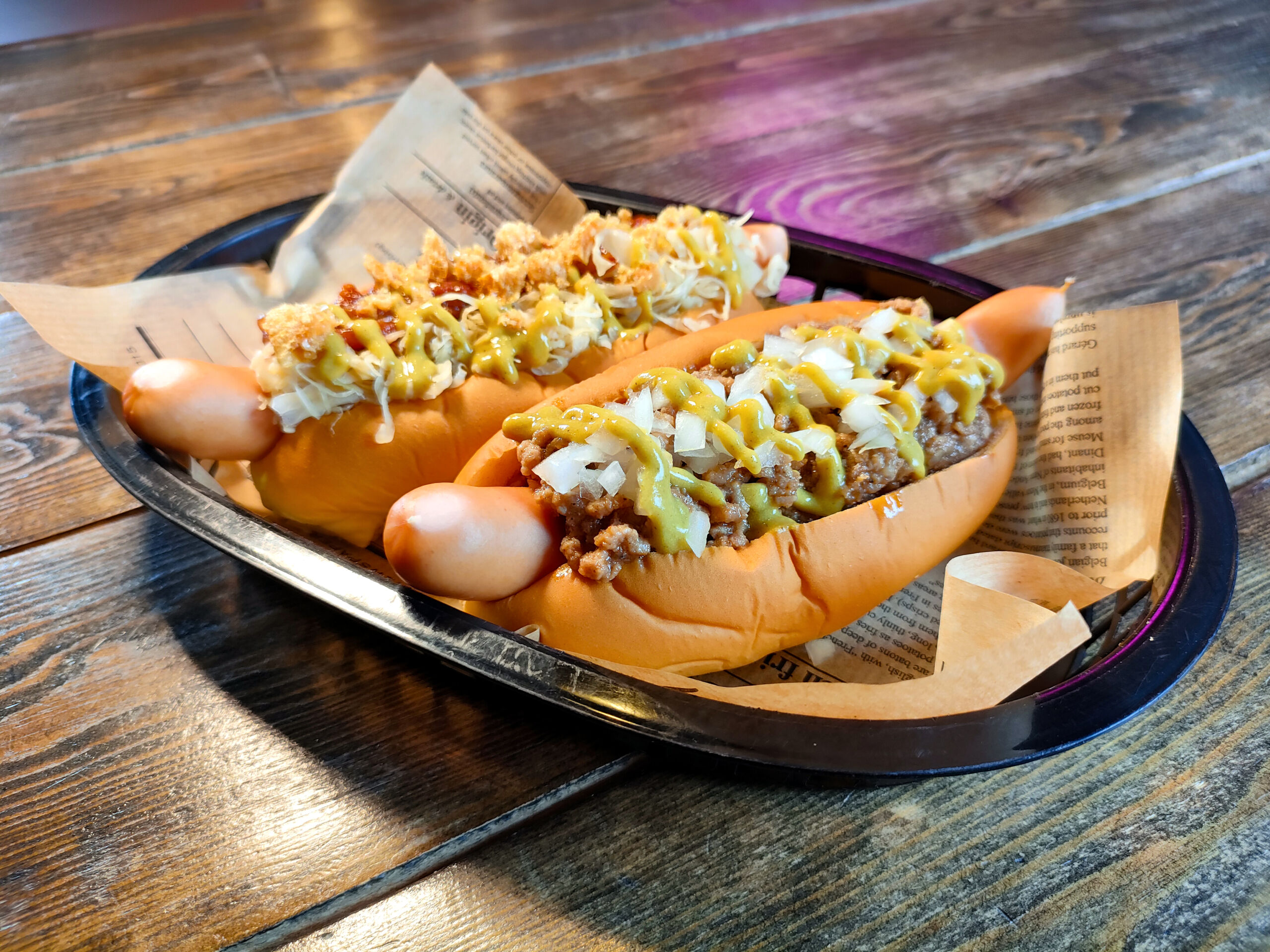 Ingredientes Coney Island: Frankfurt estilo Viena, trocitos de cebolla , mostaza y salsa Coney Island (carne picada de ternera, cebolla, ajo, mostaza, tomate, pimienta negra, comino, canela y chile en polvo)