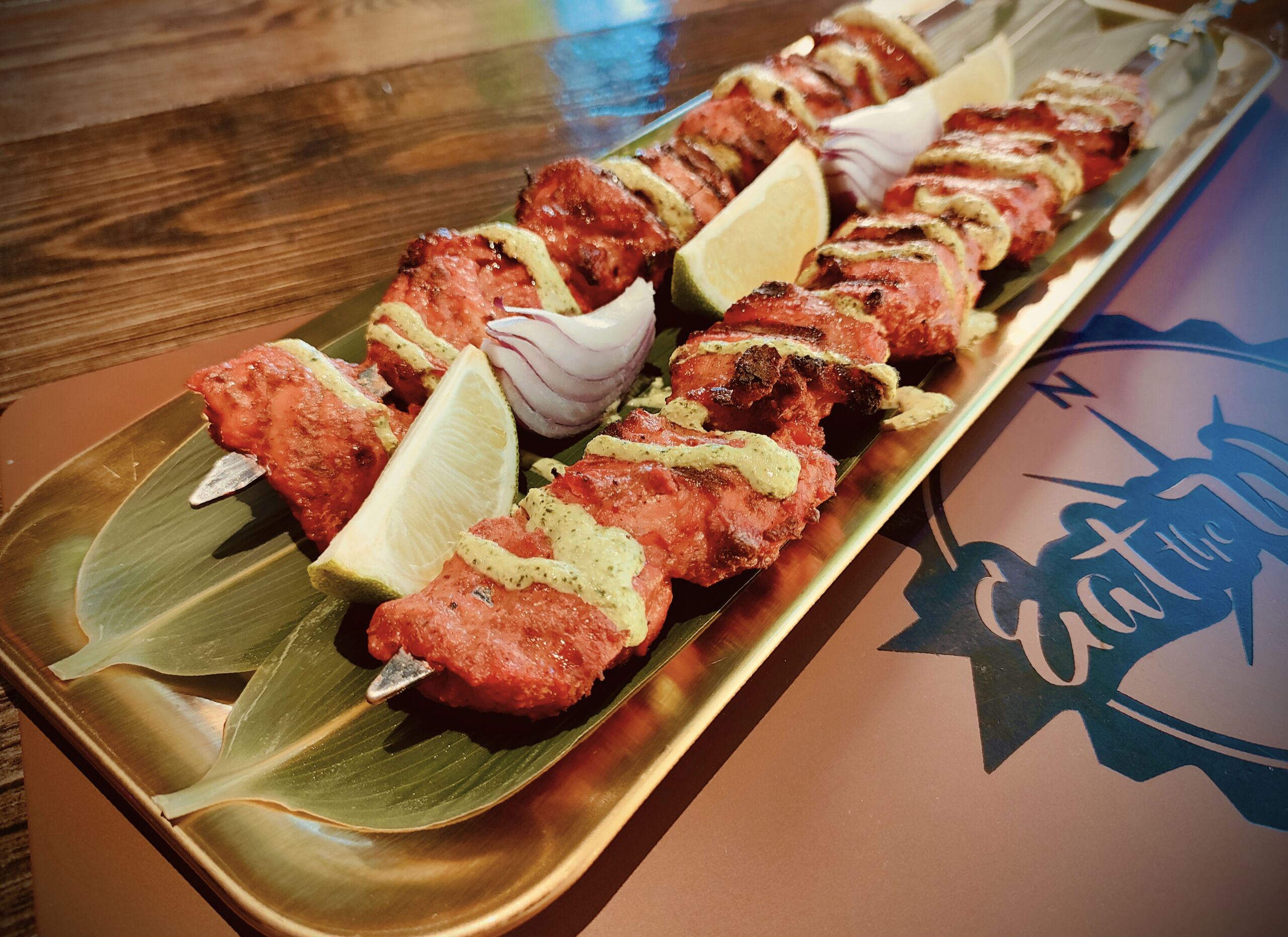 Ingredientes: Pollo macerado con yogurt y especies (pasta de ajo y jengibre). Con salsa a base de chutney de menta (menta, guindilla verde y cilantro)