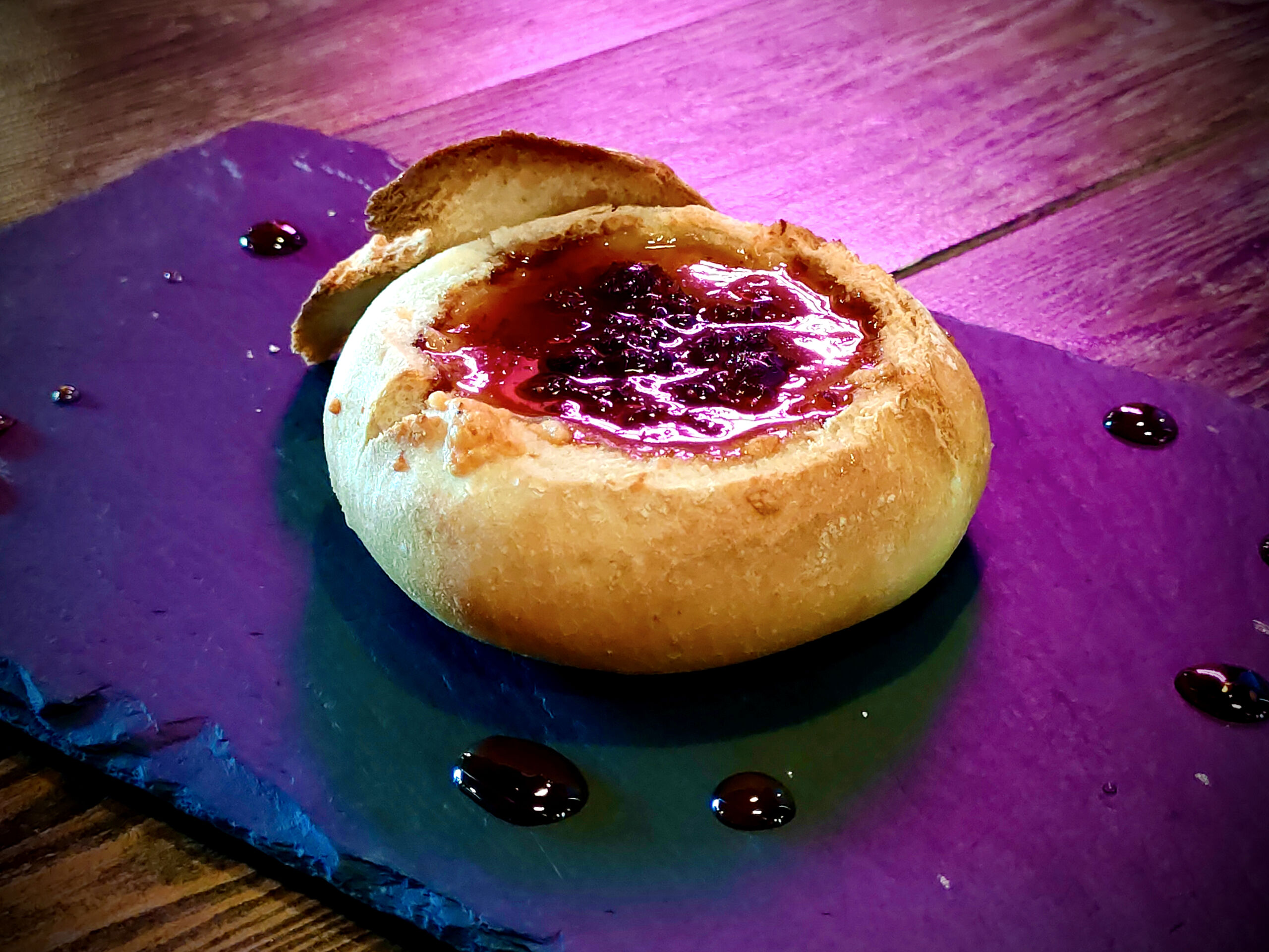 Petit panet amb tres tipus de formatge fos (Emmental, Gruyére suís i Vacherin Fribourgeois suís) amb vi blanc i un toc d’all. Tot això coronat amb una salsa dolça de nabius vermells naturals.