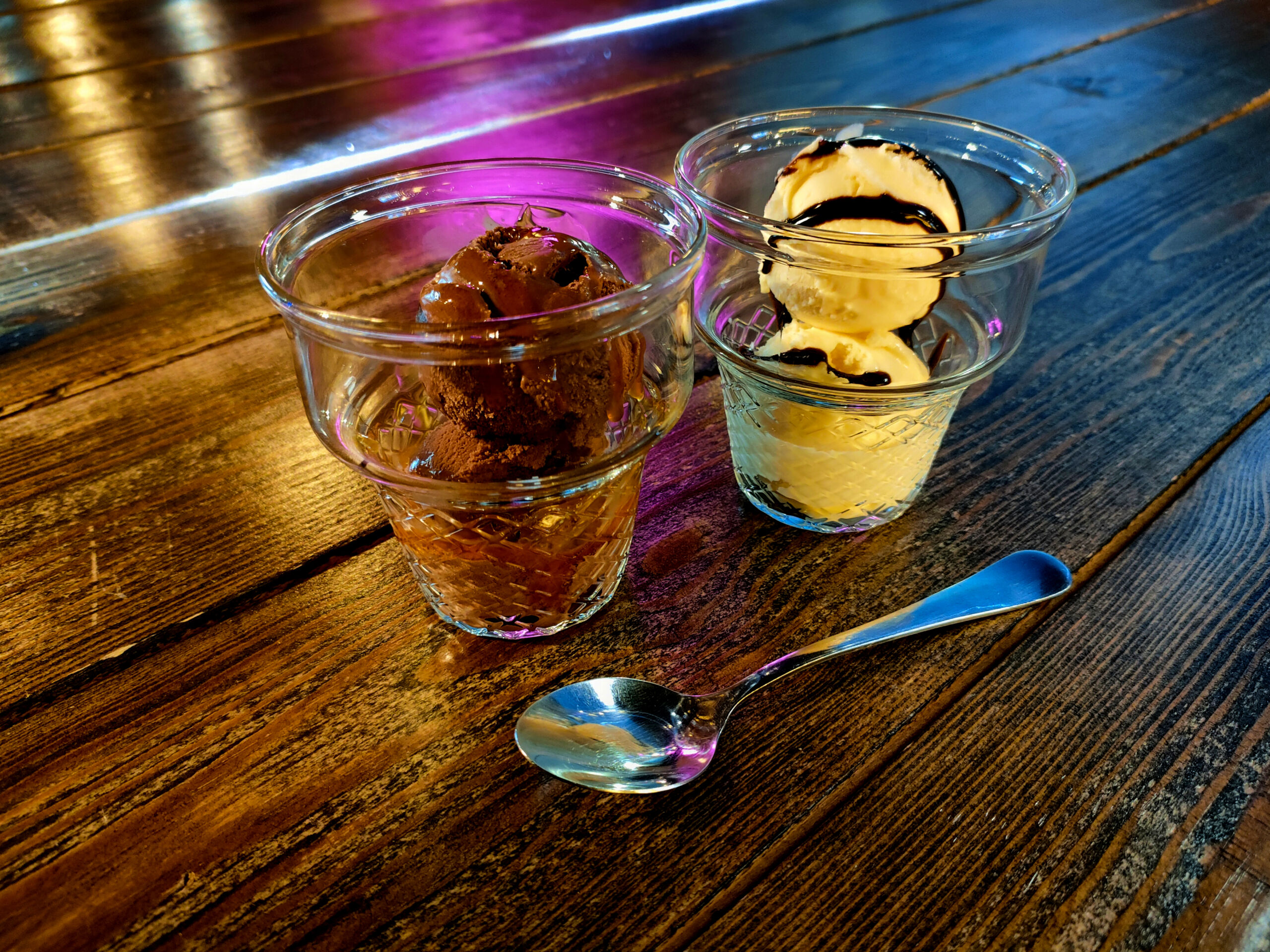 Dues boles de gelat de vanilla amb sirope de xocolata o boles de xocolata amb sirope de taronja