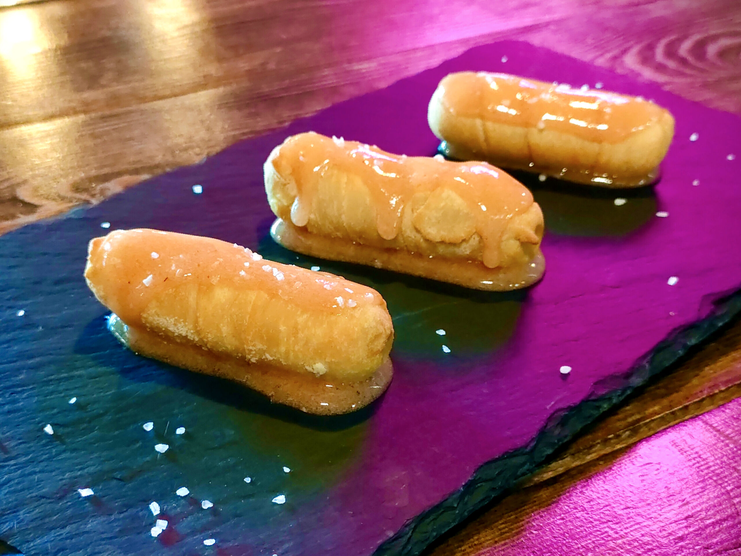 Saborós palet de massa de pa arrebossat, farcits de formatge blanc. Afegim una salsa dolça de Codony i sal.