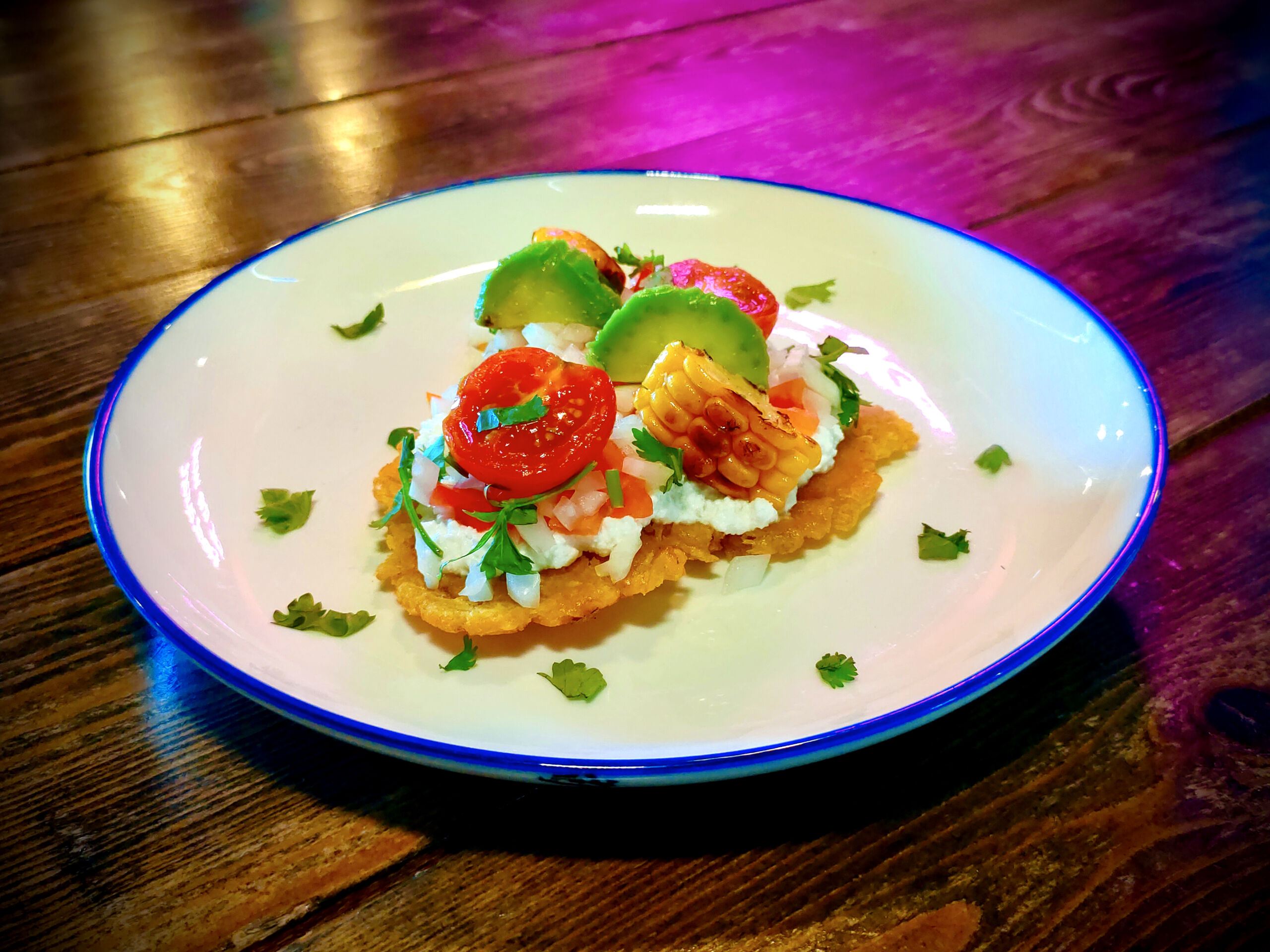 Te’ls presentem en forma de base o petita pizza coronada amb mató, tomàquet xerri, tomàquet, ceba, blat de moro, advocat i coriandre.